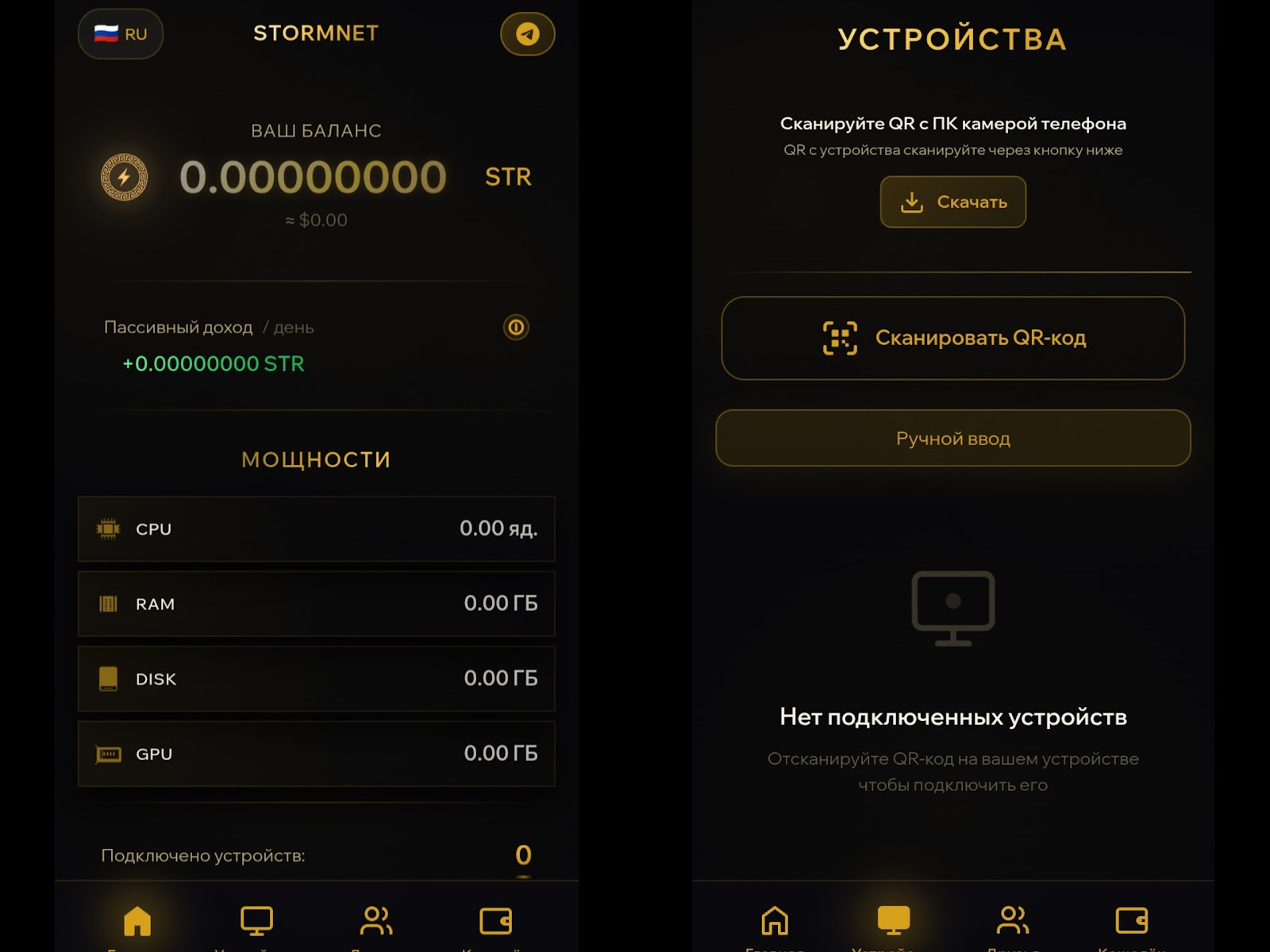 Для начала необходимо загрузить программу на ПК через официальный веб-ресурс проекта. После этого открыть мини-приложение в Телеграмме. Тг-бот проинформирует о сути проекта, и далее юзер может перейти на аккаунт, в котором содержатся такие разделы: “Главная”, “Устройства”, “Друзья”, “Кошелек”.