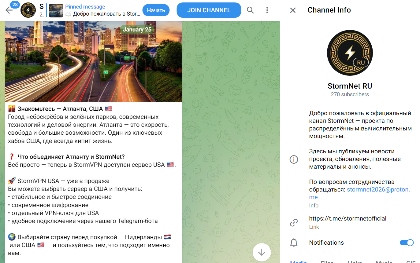 Telegram канал StormNet RU функционирует с ноября 2025 года, но первый пост размещен в январе 2026 года. Сейчас на паблик подписано 200+ человек, но просмотры публикаций превышают количество аудитории.