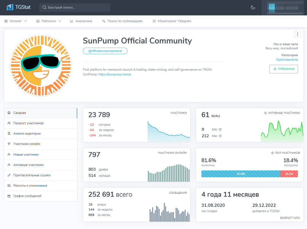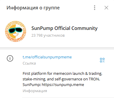 В Телеграме функционирует чат Officialsunpumpmeme. Сейчас он насчитывает почти 23,8 тысяч подписчиков и более 250 тысяч сообщений. В последний месяц есть тенденция на снижение числа участников. Ресурс запущен почти 5 лет назад. Основной язык английский, но в чате размещаются анонсы на китайском. Есть телеграм-канал Sunpumpmeme, созданный 23 августа 2024 года, где всего два подписчика и одно сообщение со ссылкой на личный блог кого-то из админов.
