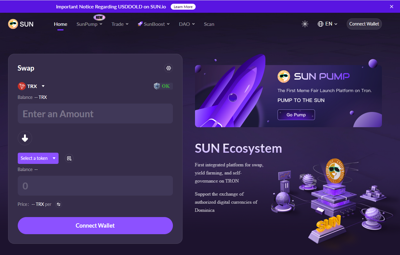 Sun Token обращается на платформе Sun Io, которая якобы функционирует с 2014 года, что указано в «подвале» сайта. По заявлению разработчиков должен способствовать развитию инфраструктуры для Web3-приложений.