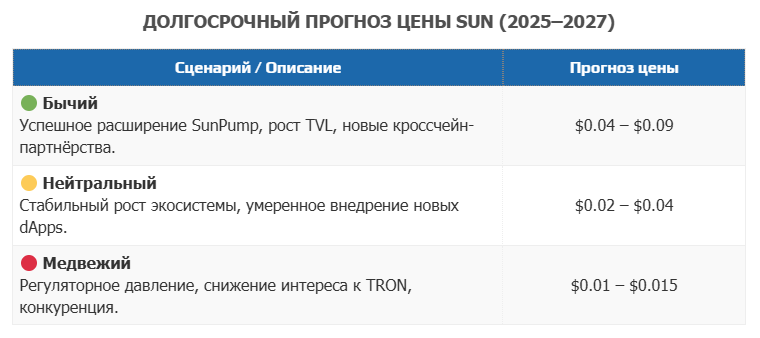 Прогноз крипты Sun, как и любой другой цифровой валюты, весьма относителен. 47% предполагаемой эмиссии пока не распределены между участниками. Для противодействия инфляции и поддержки ликвидности заложили следующую структуру: 40% на программу «майнинга» и «аирдропов», 30% – под финансирование развития, 20% на «стейкинг» и выплату вознаграждений, оставшиеся 10% – заморожены на счетах команды разработчиков до 2027 года во избежание резкого падения курса. Сейчас курс колеблется немного выше 0,02$ за токен. В трехлетней перспективе при самых благоприятных условиях ожидают рост максимум до 0,09$, но по другим оценкам курс может упасть более чем в два раза.