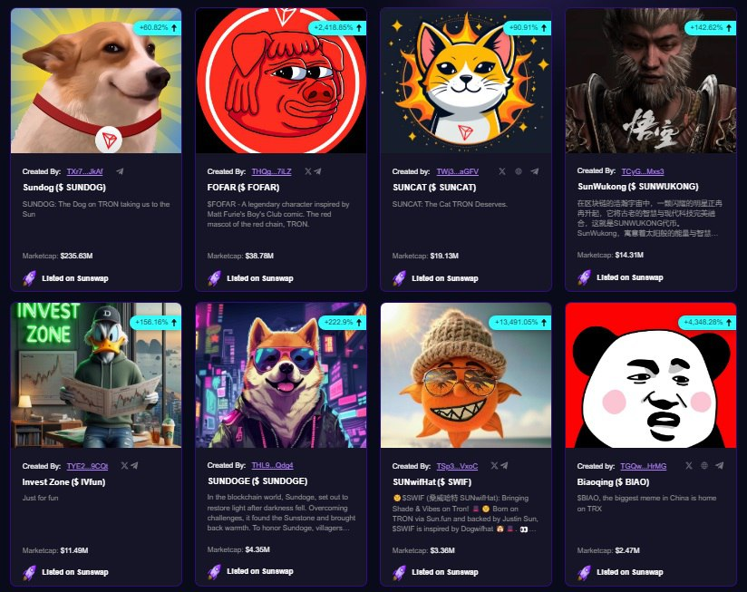 Одним из проектов экосистемы выступает платформа по торговле мем-коинов Sunpumpmeme. Особенностью площадки выступает отсутствие каких-либо преференций для кого-либо, все на равных условиях. По статистике активность здесь невысокая, разогрев публики не проводили, поэтому больших объемов торгов здесь ожидать не стоит, но сеть вполне приспособлена под торговлю мем-коинами.