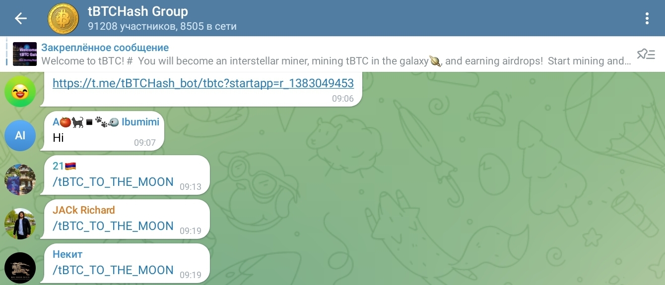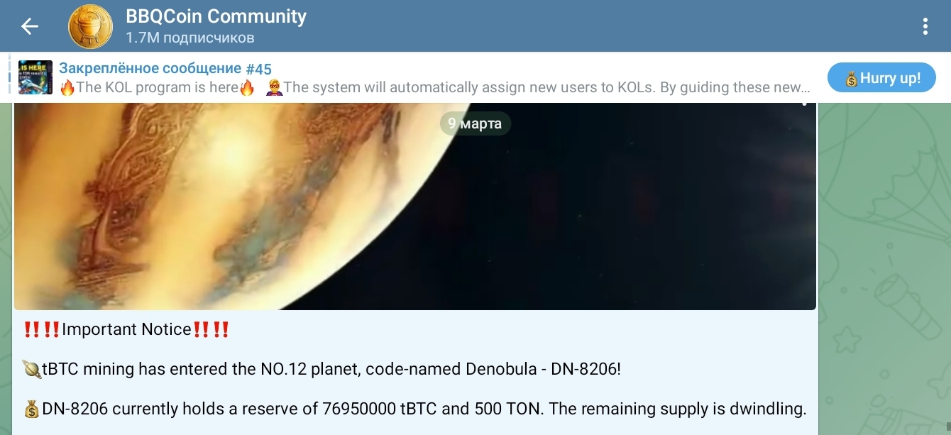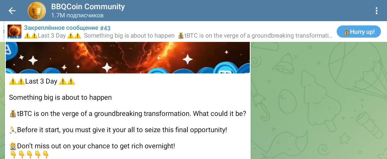 Основная аудитория сосредоточена в Телеграмме на каналах и в чатах tBtcHash Group и Community, BbqCoinTeam, BbqCoin1 и tBTCHas, а на самом крупном из них 1,7 миллиона подписчиков.