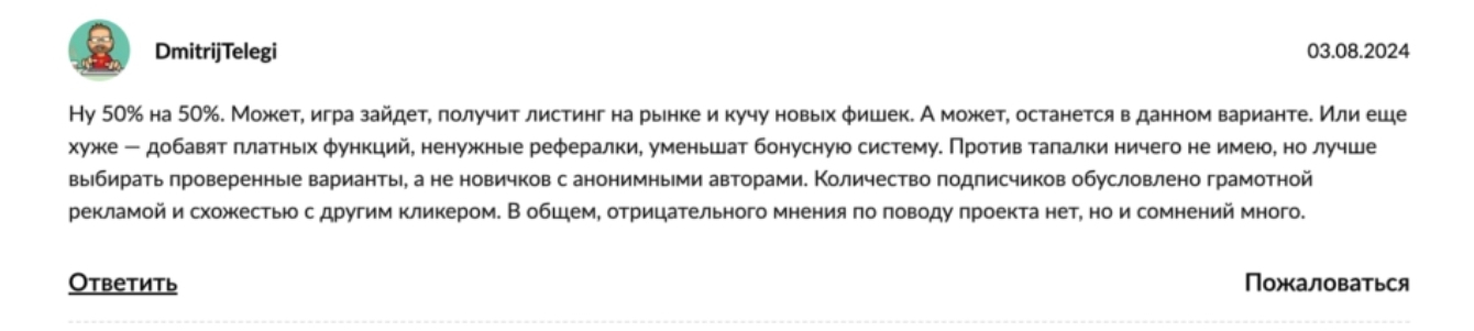 В основном все отзывы о проекте написаны до выхода токена на биржи, а так как многие не верили в листинг, то и комментарии оставляли отрицательные или нейтральные. Некоторые пользователи писали, что можно поиграть, но вкладывать деньги сюда не стоит.