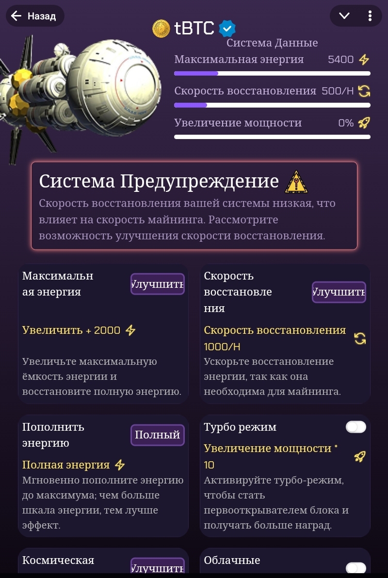 Пополнение энергии доступно за Ton и звезды в Телеграмме, а также предлагают использовать улучшения: