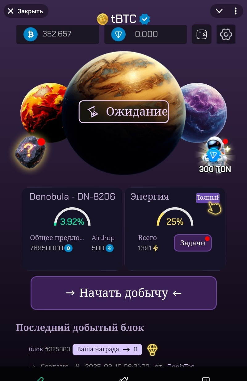Чтобы заработать монетки, нужно нажать на кнопку «Начать добычу». Энергия в количестве 5400 закончится за несколько секунд, после чего останется ждать ее восполнения, скорость которого на первоначальном этапе составляет 500 единиц в час.