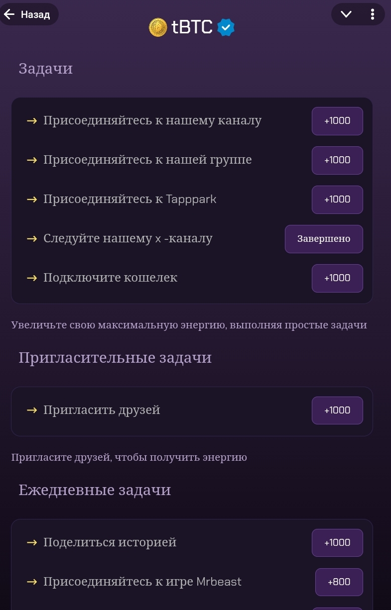 Некоторые задания можно не выполнять, например, если нажать на ссылку канала в Твиттере и не подписываться, а просто подтвердить вступление, то дадут энергию. Стратегия мало чем отличается от похожих тапалок, а чтобы понять, как играть на планетах в боте Телеграмма tBtc Hash и больше зарабатывать, нужно приглашать друзей или покупать улучшения.