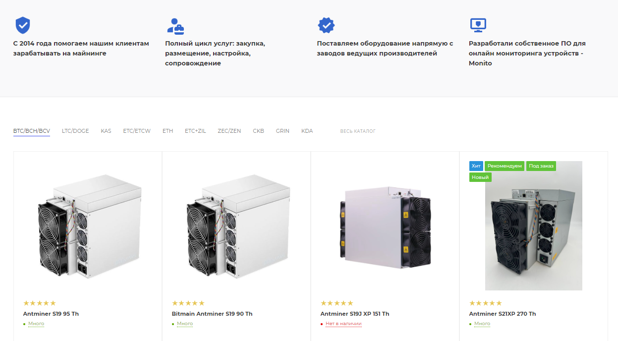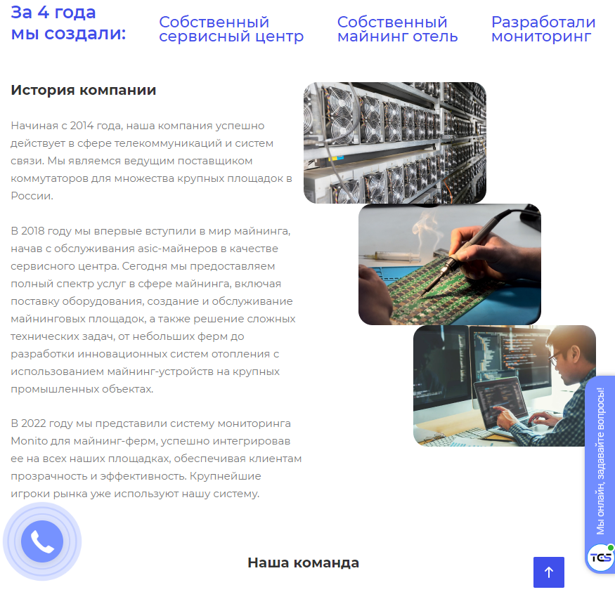 Официальный сайт продавца майнингового оборудования — tcs-mining.ru. В разделе «О компании» указана верная информация о возрасте организации. Но вот информация про 4 года ложная. Собственного майнинг-отвела и программы для мониторинга у компании нет.