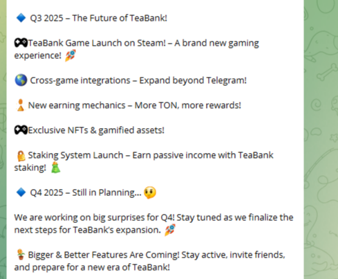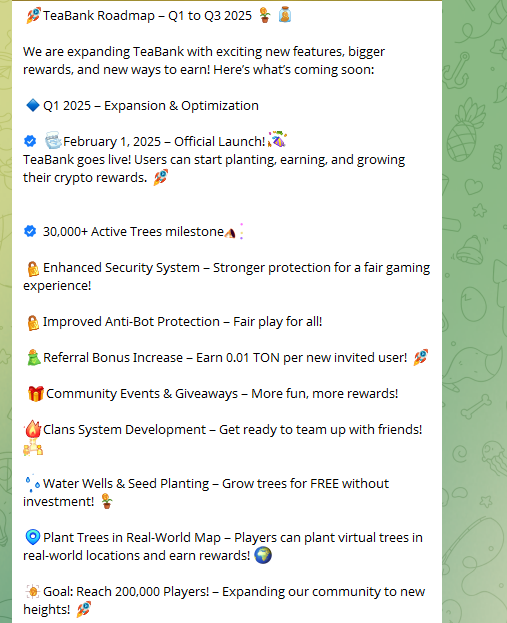На дорожной карте проекта мы увидели, что запуск telegram-игры «ТеаБанк» состоялся 1 февраля 2025 года. Получается, что приложение функционирует всего 4 месяца. На данный момент планы руководства разбиты на 4 квартала 2025 года.