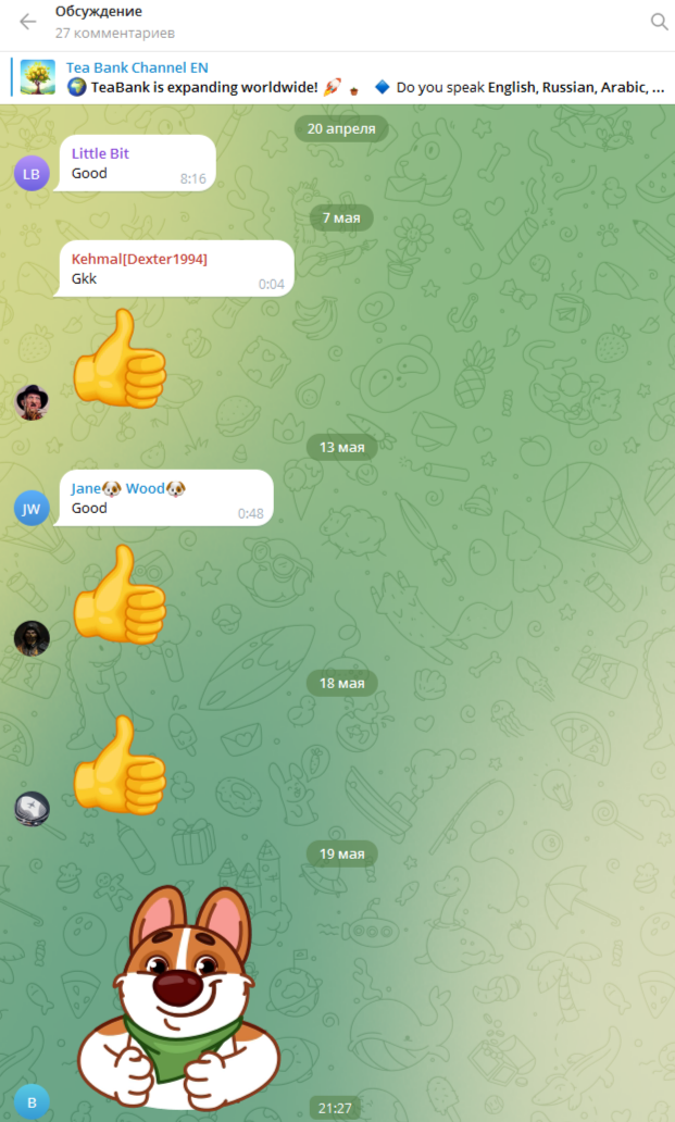 В блоге под публикациями открыты комментарии, но ничего существенного подписчики там не оставляют. Они лишь спамят и отправляют смайлики. В чате @ teabank_chat та же самая ситуация.