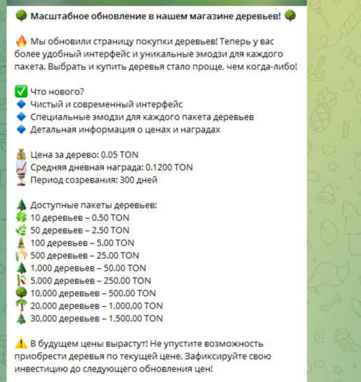В дальнейшем пользователи могут покупать десятки и тысячи таких деревьев. Стоимость одной штуки – 0,05 TON, соответственно 10 штук – 0,5 TON, 500 – 25 TON и так далее. Максимально можно купить 30 000 деревьев за 1 500 TON. Каждое дерево приносит ежедневно 0,12 TON. Период его созревания – 300 дней.Кроме этого, заработок можно увеличить участвуя в реферальной программе. За каждого приглашенного друга, который начал пользоваться приложением TEABANKIO по специальной ссылке, партнеру будет начисляться 0,05 TON. Плюс, ему будет падать еще и 5% от заработка рефералов.