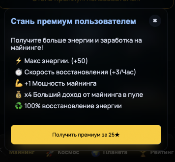 Пользователь может активировать «Премиум». Он стоит 25 Telegram Stars и значительно увеличивает скорость добычи.