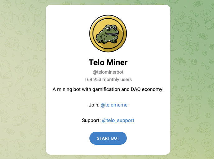 Telo Miner — игра в Telegram, в которой симулируется процесс майнинга. Пользователям предлагают участвовать в добычи блоков в одиночку или в коллаборации с другими игроками.