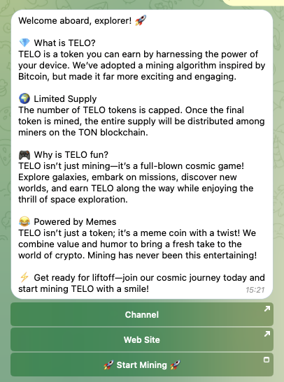 Telo Miner — мини-приложение в Telegram, в котором предлагают участвовать в добычи блоков. Игроки предполагают, что в будущем за участие им выплатят награды.