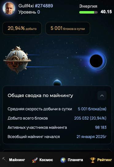 Дата старта майнинга — 21 января 2025-го года. Это следует из информации в разделе «Рейтинг» мини-приложения «ТелоМайнер».