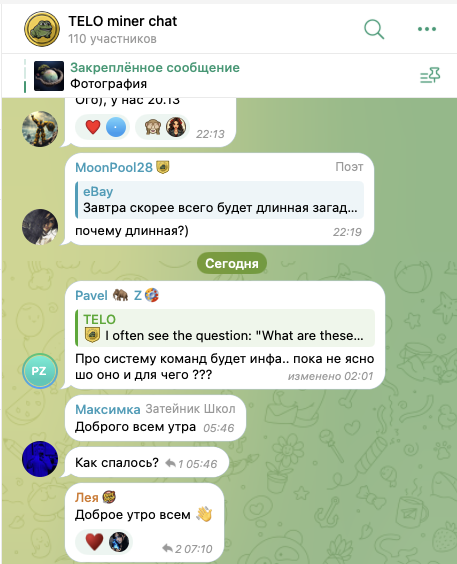 В Telegram есть официальный русскоязычный чат — Telo Miner Chat, telomeme chat. В нем состоит 110 участников. Несмотря на это, активность в чате высокая. За сутки в ленте данного аккаунта может появиться до 50-ти новых сообщений.