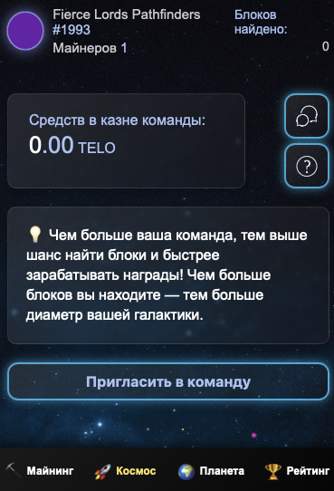 В разделе «Космос» визуально отображаются добытые в игре блоки. Тут же находится и инструмент для приглашения в проект новых пользователей.