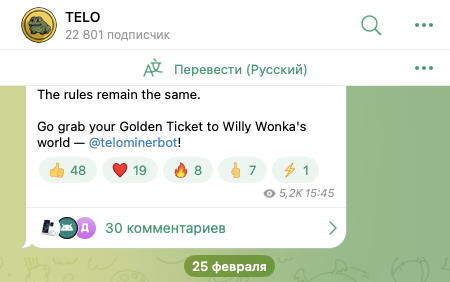 Основной аккаунт проекта Telo Miner — это телеграмм-канал Telo, telomeme. На него, на 3 марта 2025-го года, подписано около 22,8 тысяч пользователей.