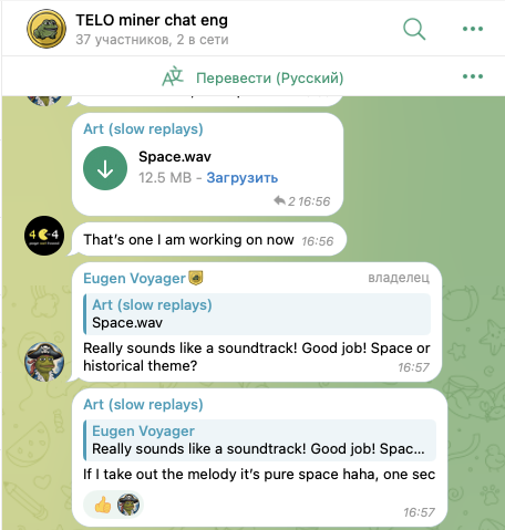 Англоязычный чат проекта — Telo miner chat eng, telomeme chat eng. В нем, на 3 марта 2025-го года, состоит 37 участников. За сутки в его ленте в среднем появляется по 3-10 сообщений.