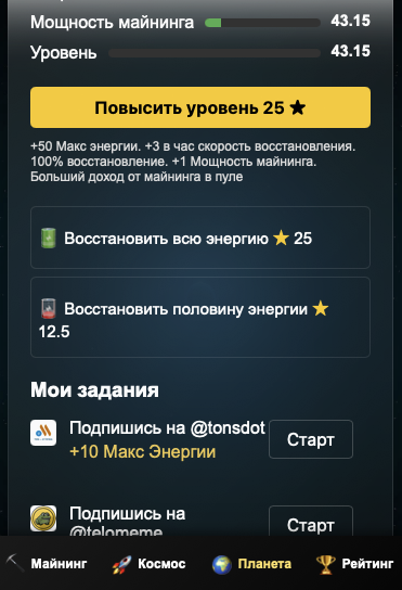 В разделе «Планета» присутствуют дополнительные улучшения. В нем за 25 Telegram Stars можно повысить уровень майнера, а еще за 25 «Звезд» моментально и полностью восстановить энергию. Также в разделе «Планета» есть задания, за выполнение которых дают бонусы.