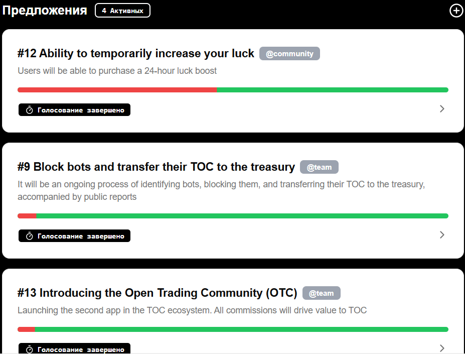 Есть раздел, где размещены предложения по улучшению майнинга Toc The Open Coin и там можно проголосовать за понравившееся. Предложить свое улучшения можно только если на балансе есть не менее 1000 TOC.