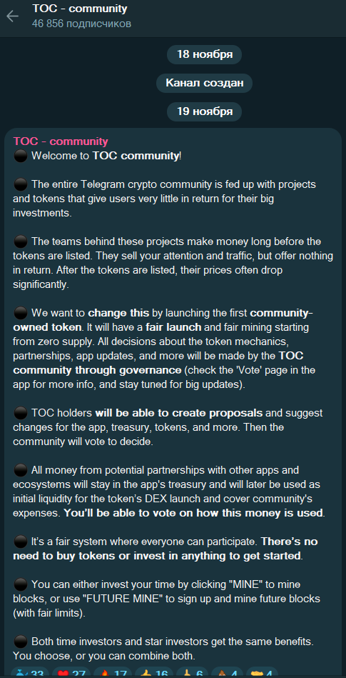 На февраль 2025 года в боте более 98 тысяч пользователей, а на телеграмм-канал с ником Toc Community подписано более 46 тысяч человек. Первые новостные посты на нем появились в конце ноября 2024 года, а сам бот для майнинга запущен был в конце января 2025.