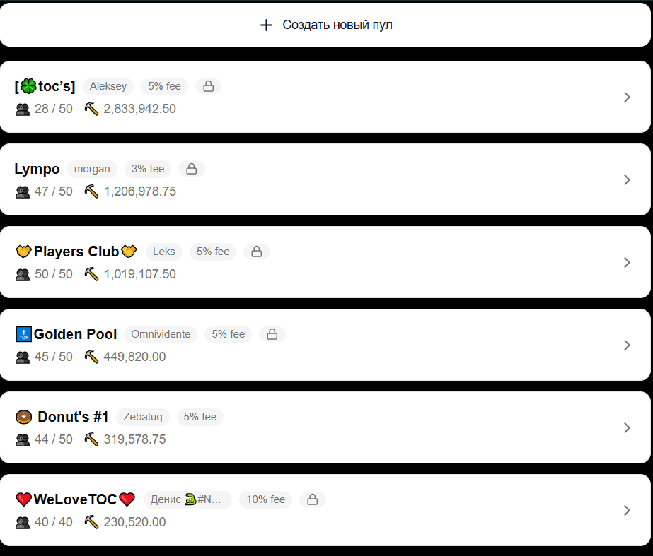 Создать свой пул стоит 20000 звезд Телеграм, там же можно указать комиссию, которая будет взиматься со всех блоков пула. При создании пула можно выбрать какой он будет: приватный или публичный. Их отличие в том, что к приватному можно будет присоединиться только по реферальной ссылке.