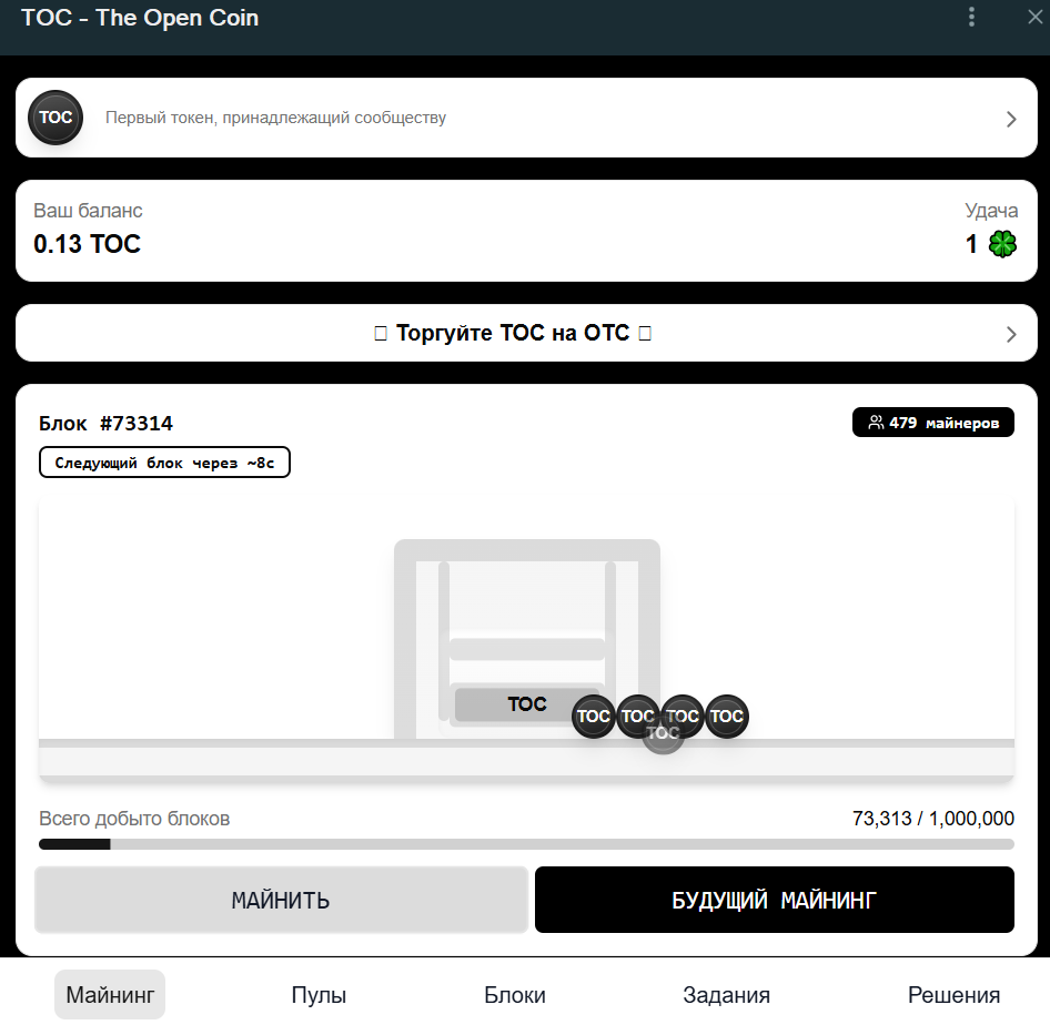 Toc – это токен, который можно заработать маня блоки в приложении. Зайти в него можно через телеграмм-бот и вход бесплатный. В майнинге есть такое понятие как «удача» и чем она выше, тем больше шансов на то, что пользователя выберут майнером блока. Они могут получить 51 % наград за блок, однако даже если не выберут, то оставшиеся 49 % разделятся между другими участниками.