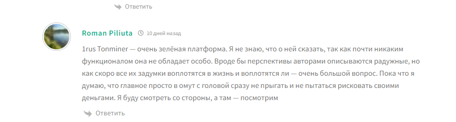 1rus Tonminer — пока очень сырая платформа. Функционала минимум, перспективы расписаны красиво, но когда и реализуют ли их — большой вопрос. Пока советую не спешить вкладываться и не рисковать деньгами. Сам понаблюдаю со стороны — время покажет.