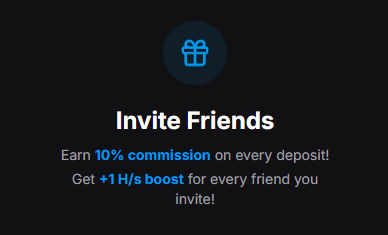 Реферальная программа позволяет получать 10% комиссий с прибыли приглашенного пользователя и дополнительные 1 H/s за каждого человека. Это, вероятно, единственный бесплатный способ сильно увеличить доходность, но нужна большая аудитория.