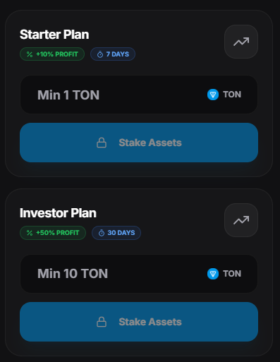 Дополнительным способом заработка в Ton Run Miner является стейкинг. Вложить коины можно по одному из трех планов на неделю, месяц или 90 дней. Чем длительнее период, тем больше будет процент к депозиту, однако здесь опять же требуется донат в виде TON. К тому же, очевидно, данный процесс не имеет ничего общего с реальным стейкингом, а лишь имитирует его. Откуда в таком случае берется доходность – неясно.