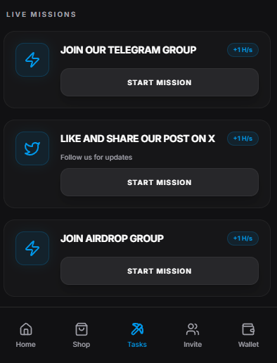 С помощью заданий в разделе “Tasks” в общей сложности можно увеличить скорость добычи на 3 H/s. Квесты здесь не обновляются, поэтому это максимум.