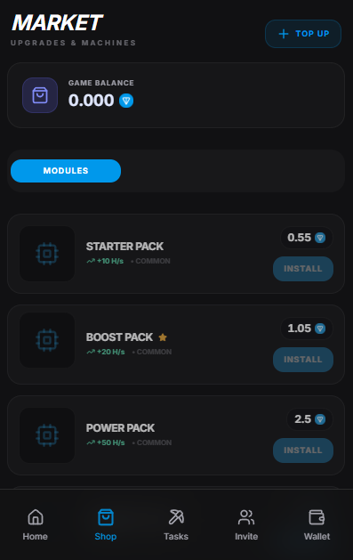 Однако при стандартном варианте майнинг будет слишком долгий, поэтому пользователям предлагают ускорить процесс с помощью бустеров. Их можно приобрести в магазине за цену от 0,55 до 10 TON. Однако мы не рекомендуем делать собственные вложения, ведь шанс их не окупить очень высок.