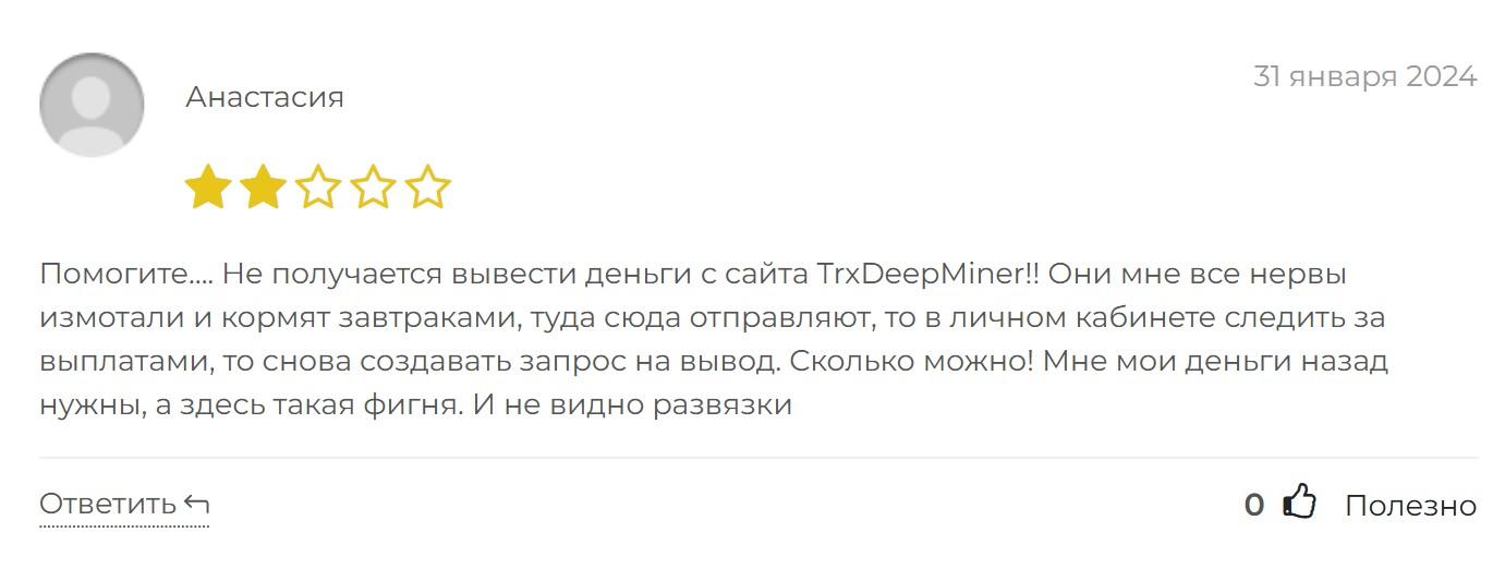О TrxDeepMiner можно найти много отзывов на просторах интернета, и все они негативные. Люди пишут, что им не вернули депозит, не выплатили доход, даже пытались разводить на дополнительные комиссии за разморозку вложений. Также есть комментарии, где клиенты говорят, что только поначалу выводили средства, а потом их кинули, что типично для финансовой пирамиды.