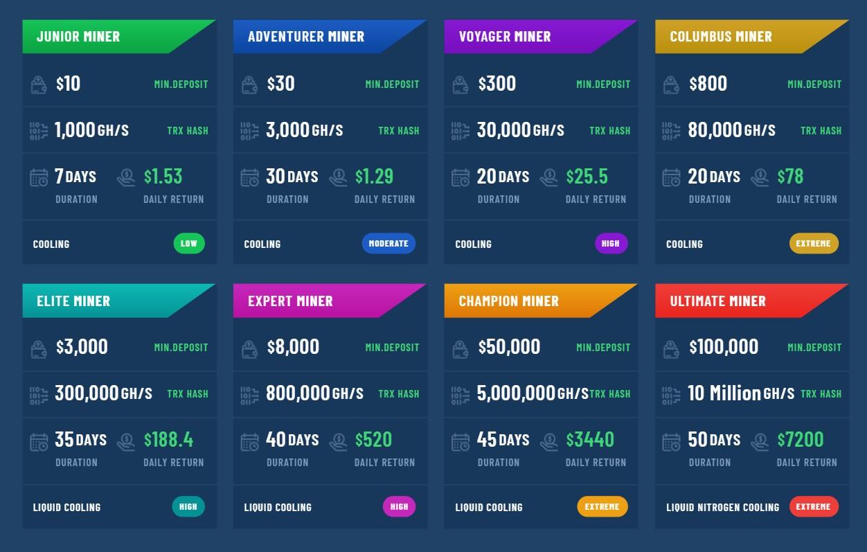После регистрации остается лишь положить деньги на счет, выбрать и оплатить тариф и можно приступать к майнингу. Предлагается несколько тарифов с разной стоимостью. Самый бюджетный требует депозита размером $10. После пополнения баланса по этому тарифному плану средства замораживаются на неделю. Каждый день начисляется по $1,53.