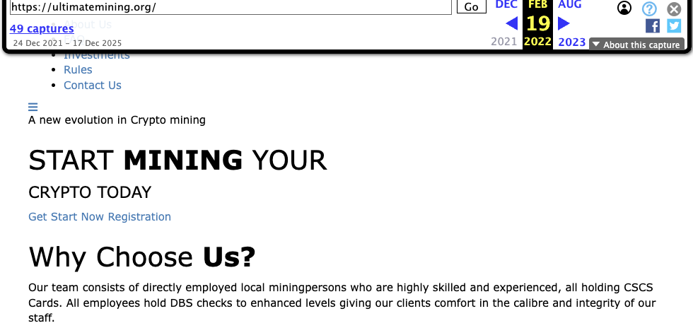 В 2022-ом же, в свою очередь, на сайте, располагавшемся по адресу ultimatemining org, было опубликовано предложение инвестировать в добычу криптовалют.