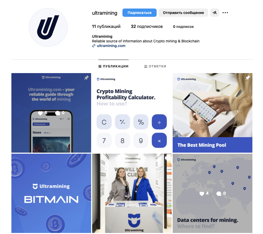 Другой аккаунт проекта – это страница Ultramining в Instagram. На нее подписано 32 человека. При этом, посты собирают по 3-5 лайков.