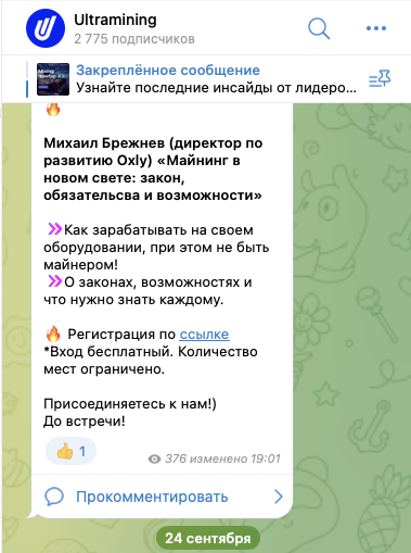 Основной аккаунт проекта в соцсетях – это телеграмм-канал Ultramining, ultraminingcom. На него, на 16 октября 2024-го года, подписано около 2,8 тысяч пользователей.Однако публикации просматриваются лишь сравнительно небольшой частью этой аудитории. Так, каждый пост получает всего 350-400 показов. А число пользовательских реакций – 1-3 штуки на публикацию. Комментариев под постами, в свою очередь, практически никогда не бывает.