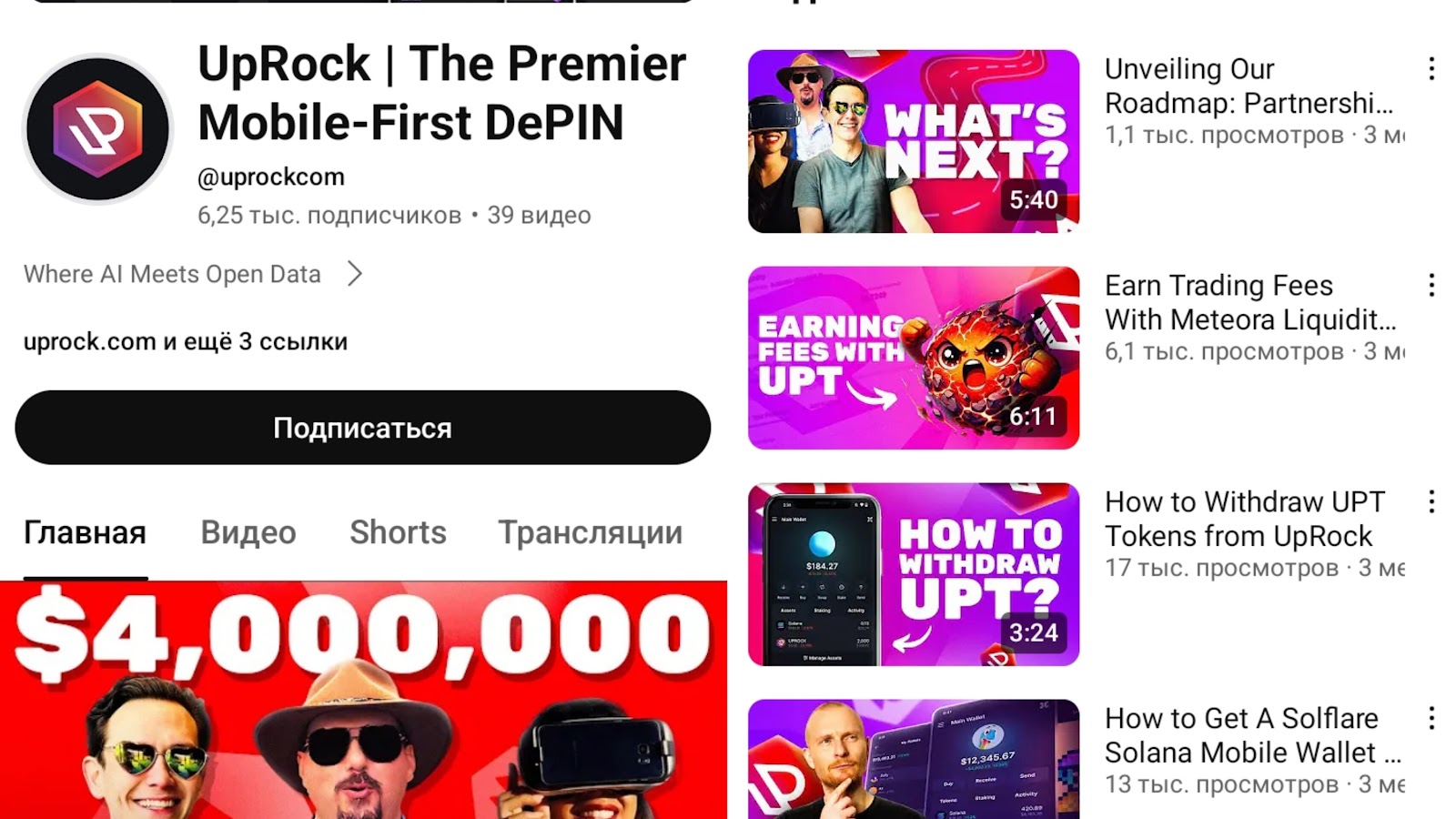 На платформе оставлены ссылки на социальные сети проекта. Например, YouTube канал UpRock The Premier Mobile DePIN. Он был создан в январе 2023 года. Сейчас на страницу подписано 6.25 тысяч пользователей.