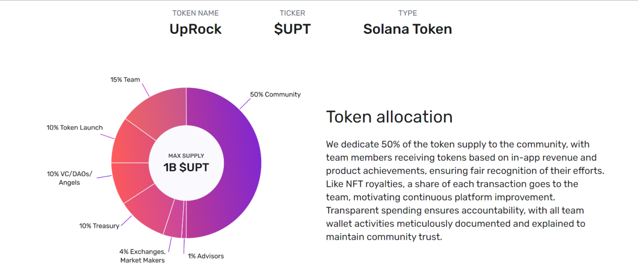 Главная криптовалюта (крипта) Uprock — UPT. Именно ее и предлагают зарабатывать за раздачу ненужного интернета. Токен разработан на сети Солана. Исходя из токеномики: 50% сообществу, 15% токенов будут отправлены команде, 10% на лаунч, 10% VC\DAOs, 10% казначейству, 1% на рынок, 1% советникам. Максимальное предложение монет 1 B.