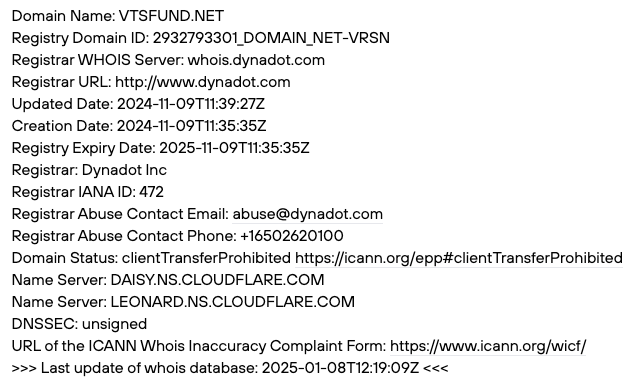 Чтобы в этом убедиться, мы запросили данные доменных имен сайта из сервиса Whois. Выяснили, что, например домен vtsfund net был зарегистрирован 9 ноября 2024-го года.