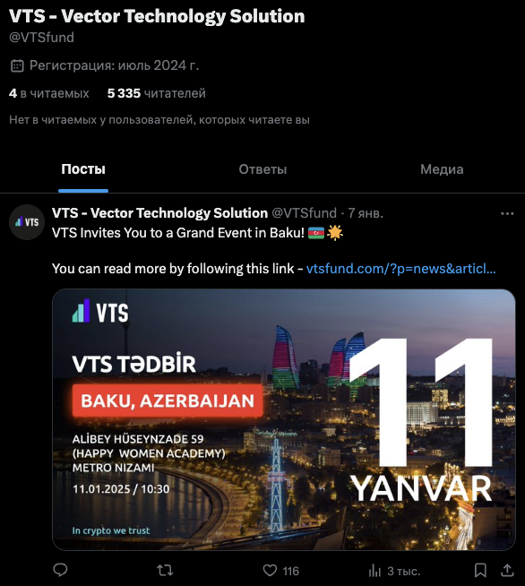 На страницу VTSfund в Twitter подписано около 5,3 тысяч читателей. Выложенный 7 января пост за сутки получил более трех тысяч показов. Остальные публикации собрали от 1 до 5 тысячи просмотров.