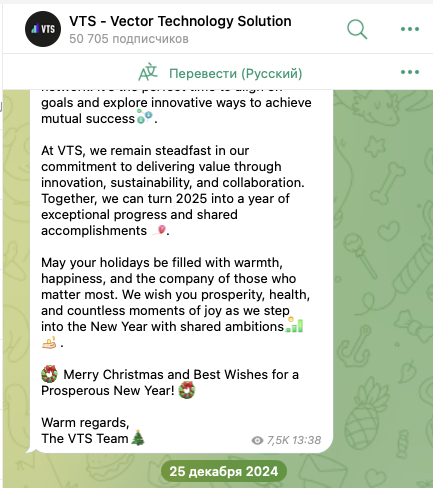 У компании есть аккаунты в соцсетях. Основной из них — телеграмм-канал VTS Vector Technology Solution, VTS OfficialNews. На него, на 8 января 2025-го года, подписано около 50,7 тысяч пользователей.