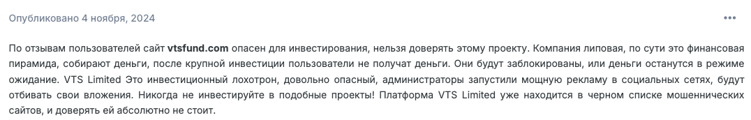 Мы нашли лишь несколько ревью на организацию. Из отзывов следует, что VTS Limited — это иностранная форма, которая разводит людей на деньги.