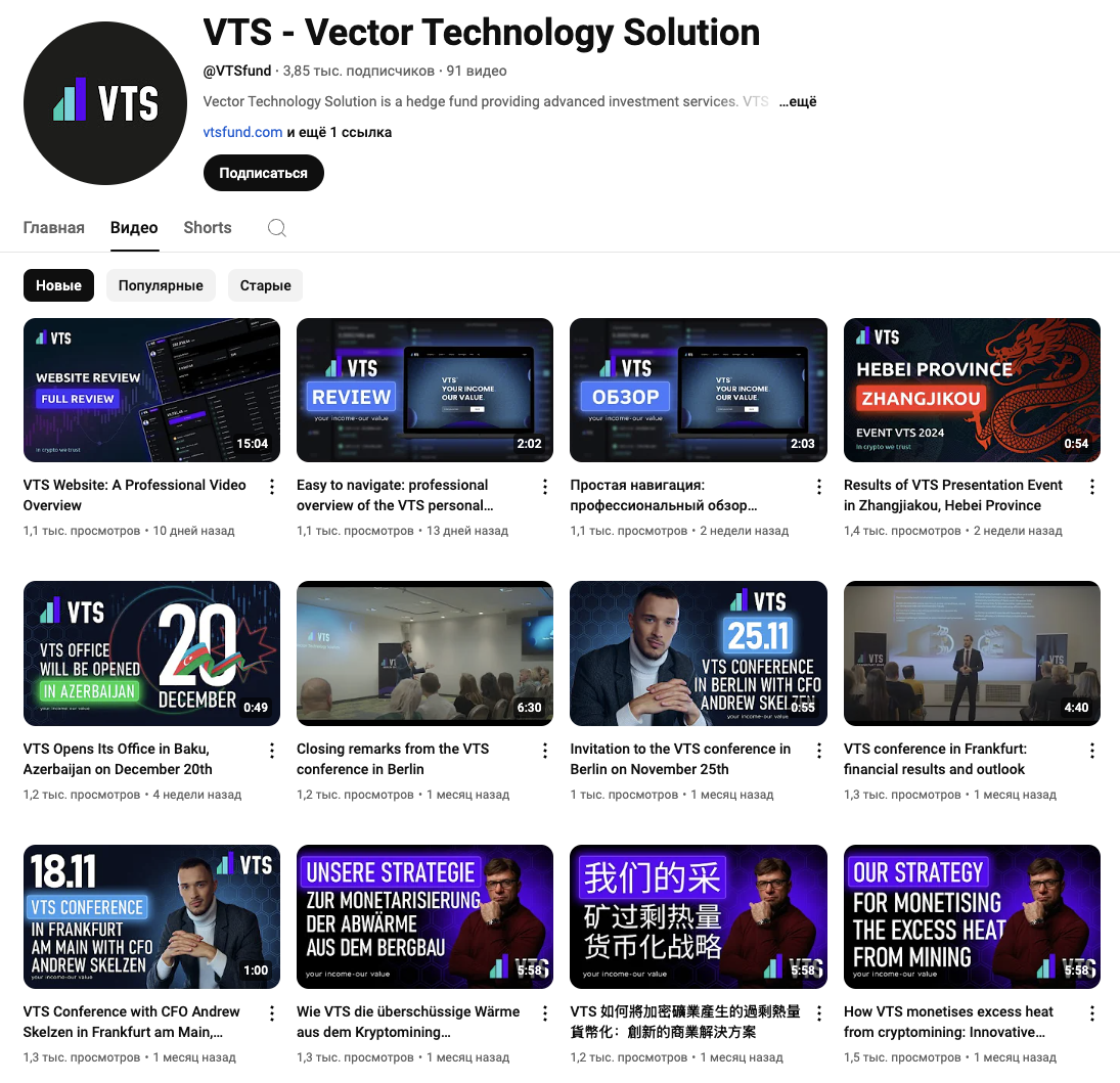 У компании есть канал на Ютуб — VTSfund. На него подписано 3,85 тысяч пользователей. За все время на канал было выложено 91 видео. Первые ролики опубликовали около двух месяцев назад. Возможность оставлять комментарии под видео отключена.