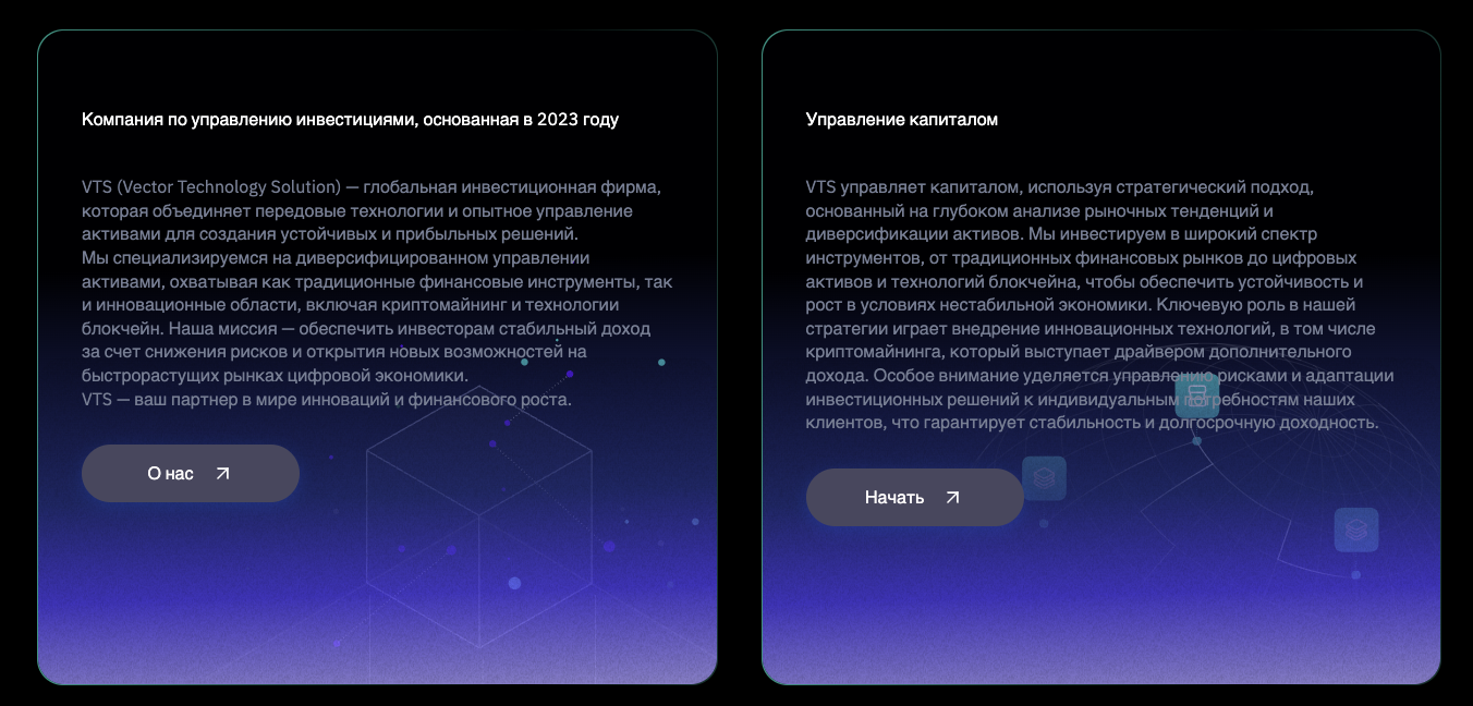 По другим адресам сайт компании Vector Technology Solution недоступен. Данный обзор написан 8 января 2025-го года. Исходя из этого, делаем вывод, что платформа работает не более полугода.Аккаунты проекта в соцсетях