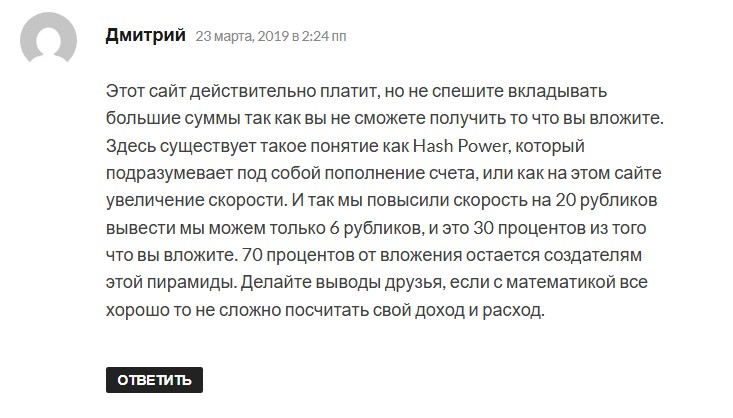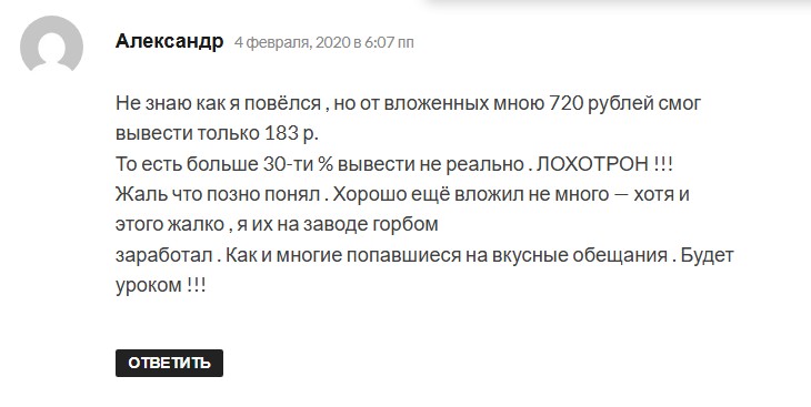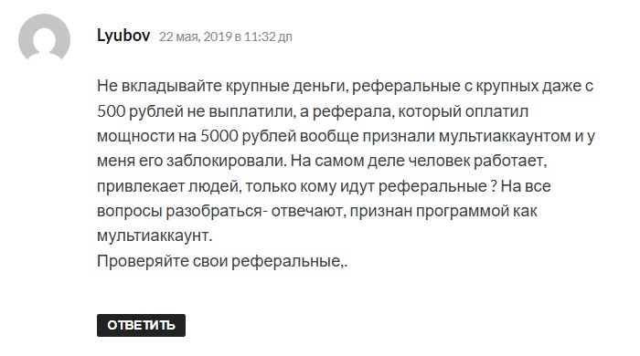 Многих после пополнения счета ждал отказ в выплатах. Деньги оставались на депозите, но не выводились. Реферальные отчисления корректируются в режиме реального времени. Причем без предупреждения. Пользователи сообщают о блокировке. А негативные комментарии на сайте модерируются.
