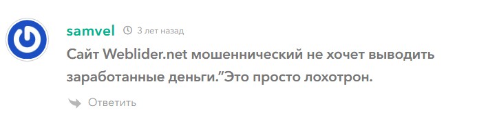 Отзывы о Weblider Net в интернете противоречивые. Некоторое время проект выплачивал средства. Это были копейки для привлечения новых пользователей. Со временем появилось все больше жалоб. Абсолютно все утверждают, что забрать заработанное не получится.