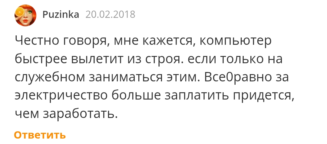 - Постоянная нагрузка на процессор сокращает срок службы техники. Получается,если ноутбук или пк выйдет из строя из-за майнинга, ремонт обойдётся дороже всех заработанных через сервис рублей.