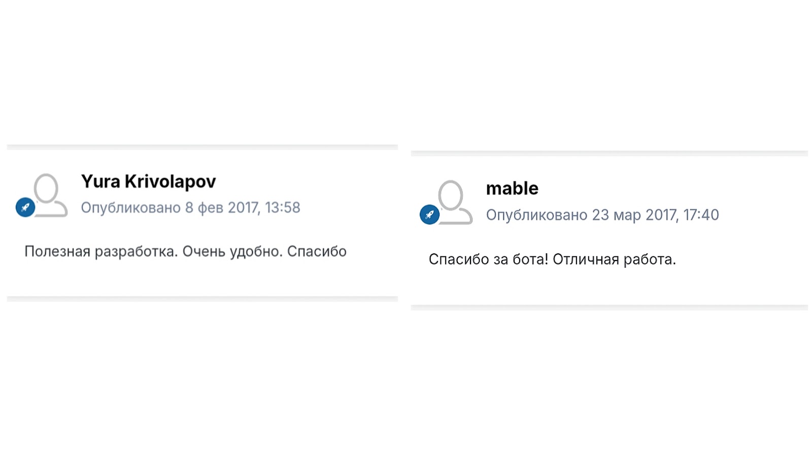 В соцсетях закрыто комментирование, а чата автор не создал. На сторонних ресурсах есть положительные комментарии, в которых пишут о том, что бот полезный.